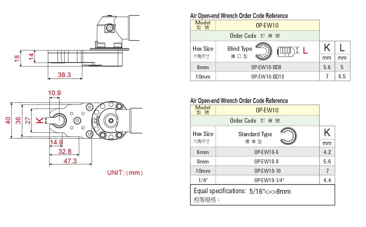 | OP-EW1 | 6, 8, 10 (1/4″) | 6 ~ 12 | 300 | 198 | 7 | 402 | 15.82 | 1/4″ | 1.65 | 3.63 | 87 |
