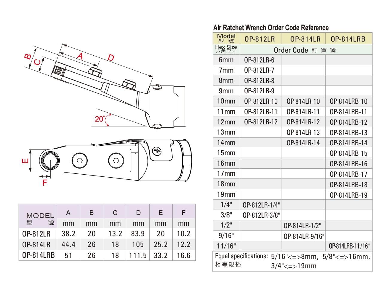 | OP-814LR | 10,11,12,13,14 (7/16″,1/2″,9/16″) | 15 | 11 | 25 | 18 | 220 | 212 | 7.5 | 327 | 12.88 | 1/4 | 1.92 | 4.23 | 87 |