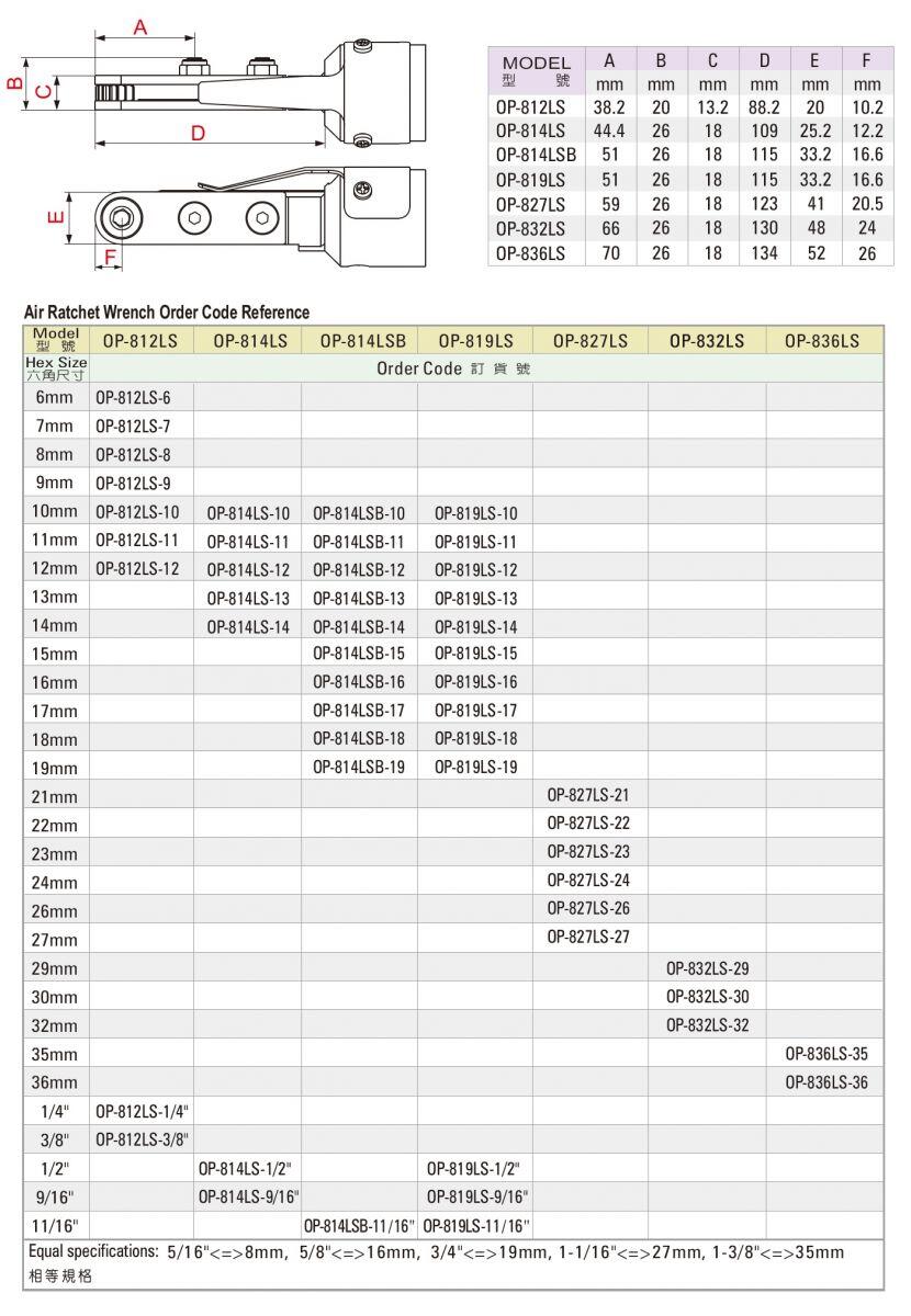 | OP-819LS | 10,11,12,13,14,15,16,17,18,19 (1/2″,9/16″,5/8,11/16″,3/4″) | 80 | 59 | 90 | 66 | 150 | 353 | 12.5 | 390 | 15.35 | 1/4 | 2.42 | 5.33 | 92 |